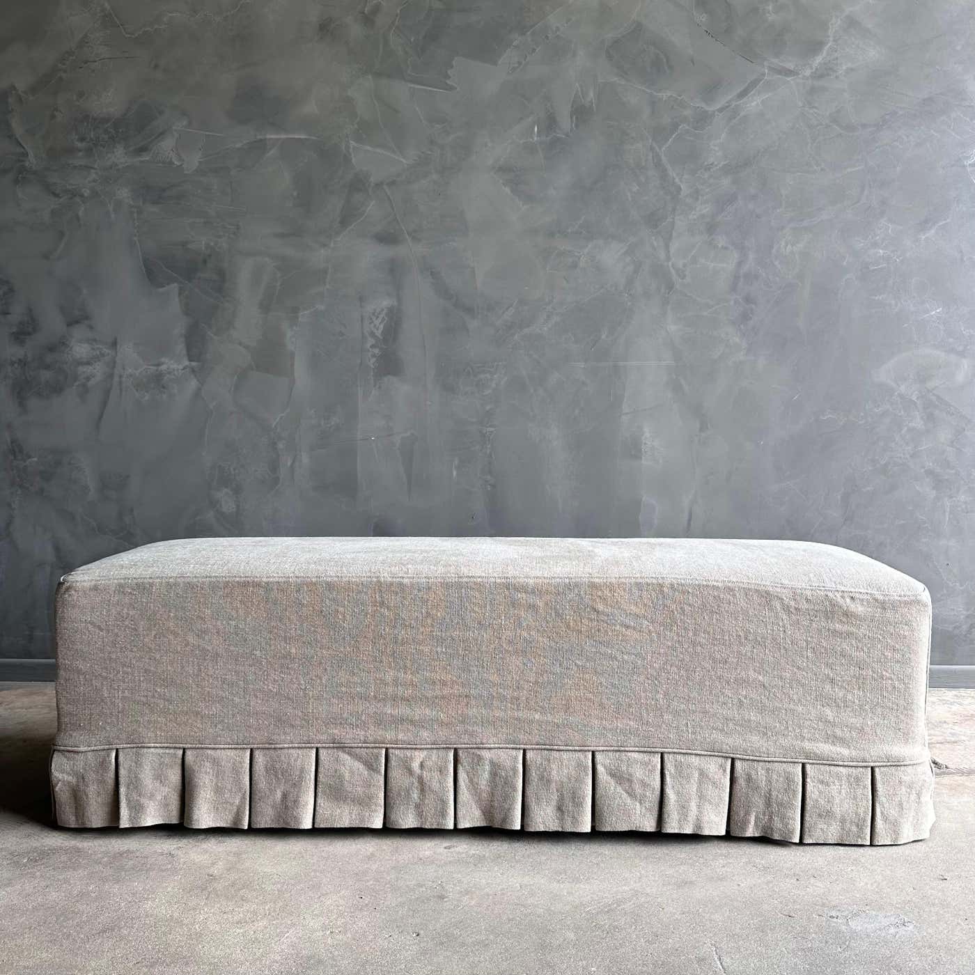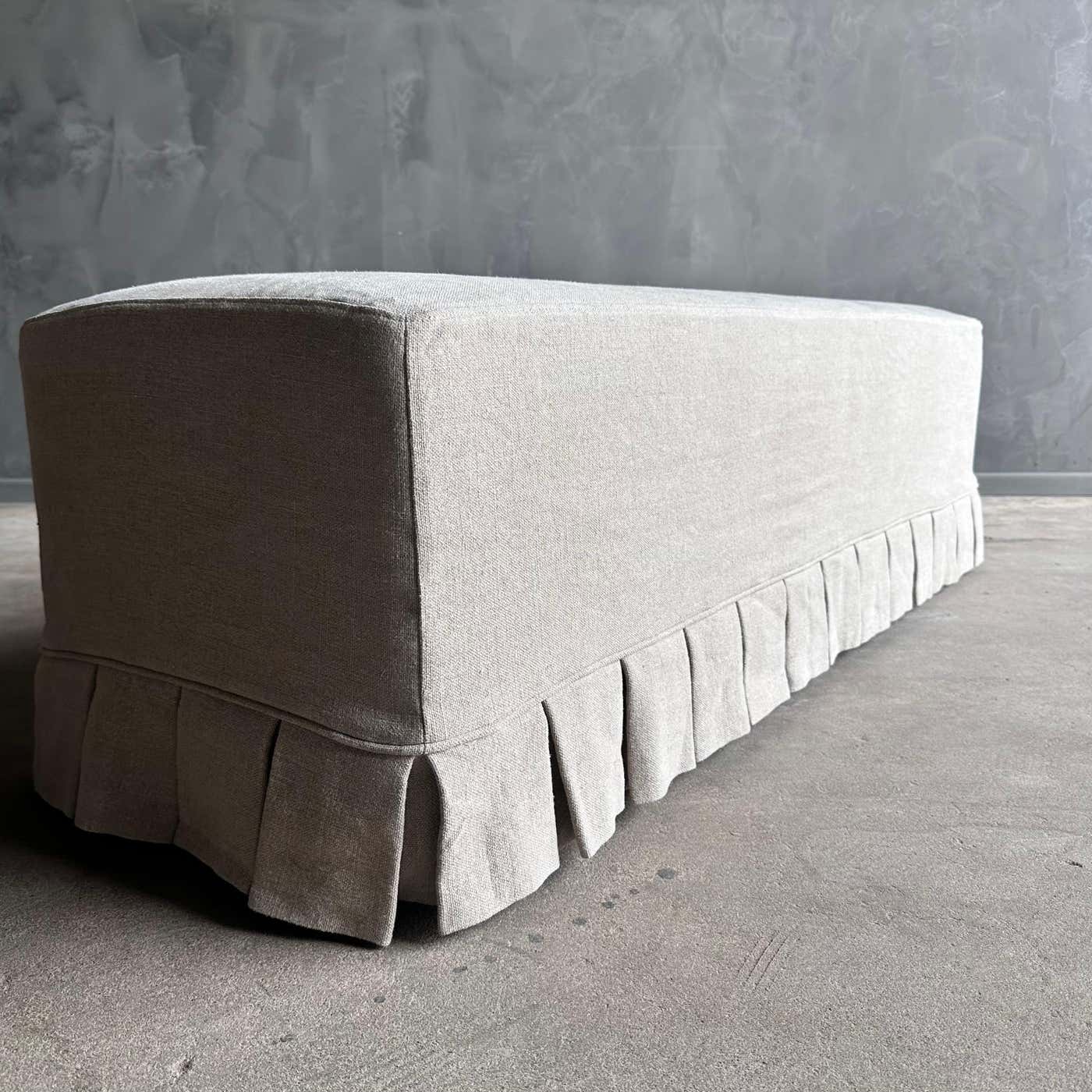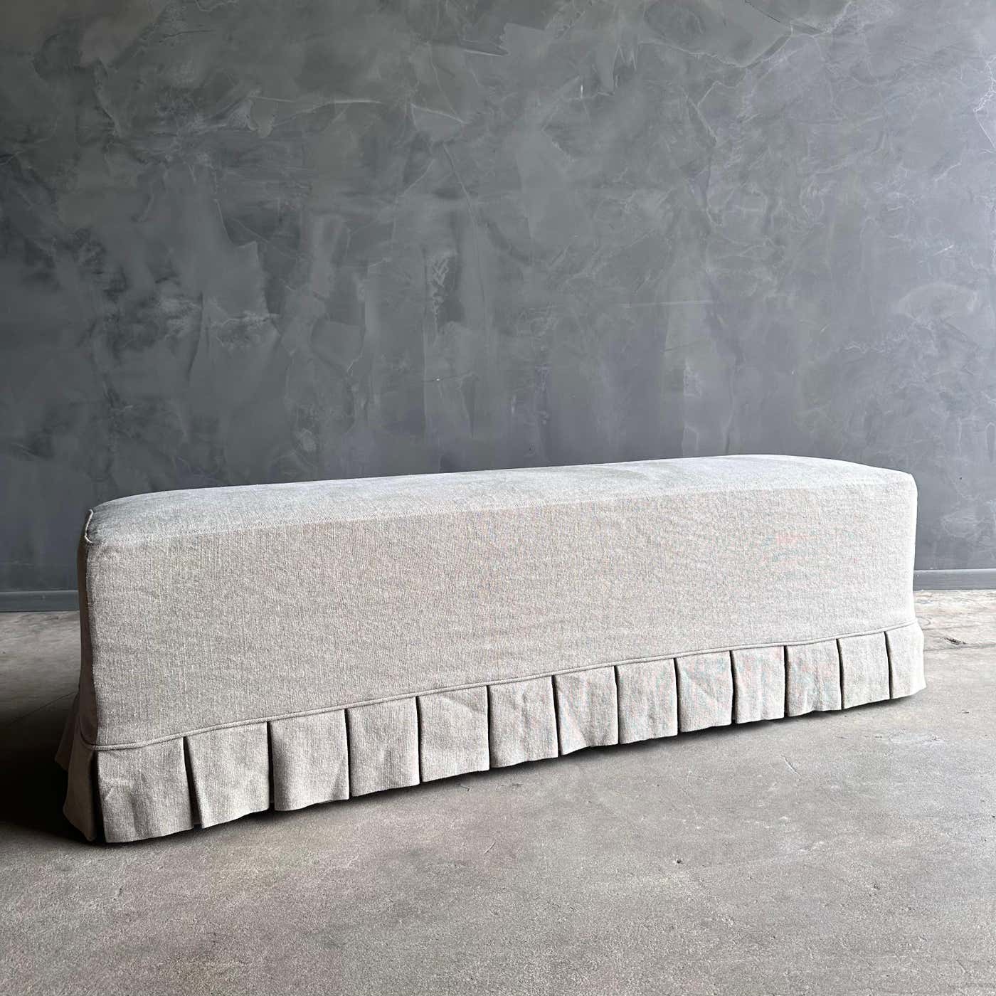 Introducing the April slip covered bench, featuring elegant white oak legs and a slip cover with a wide pleated skirt made from our luxurious greige oatmeal linen.