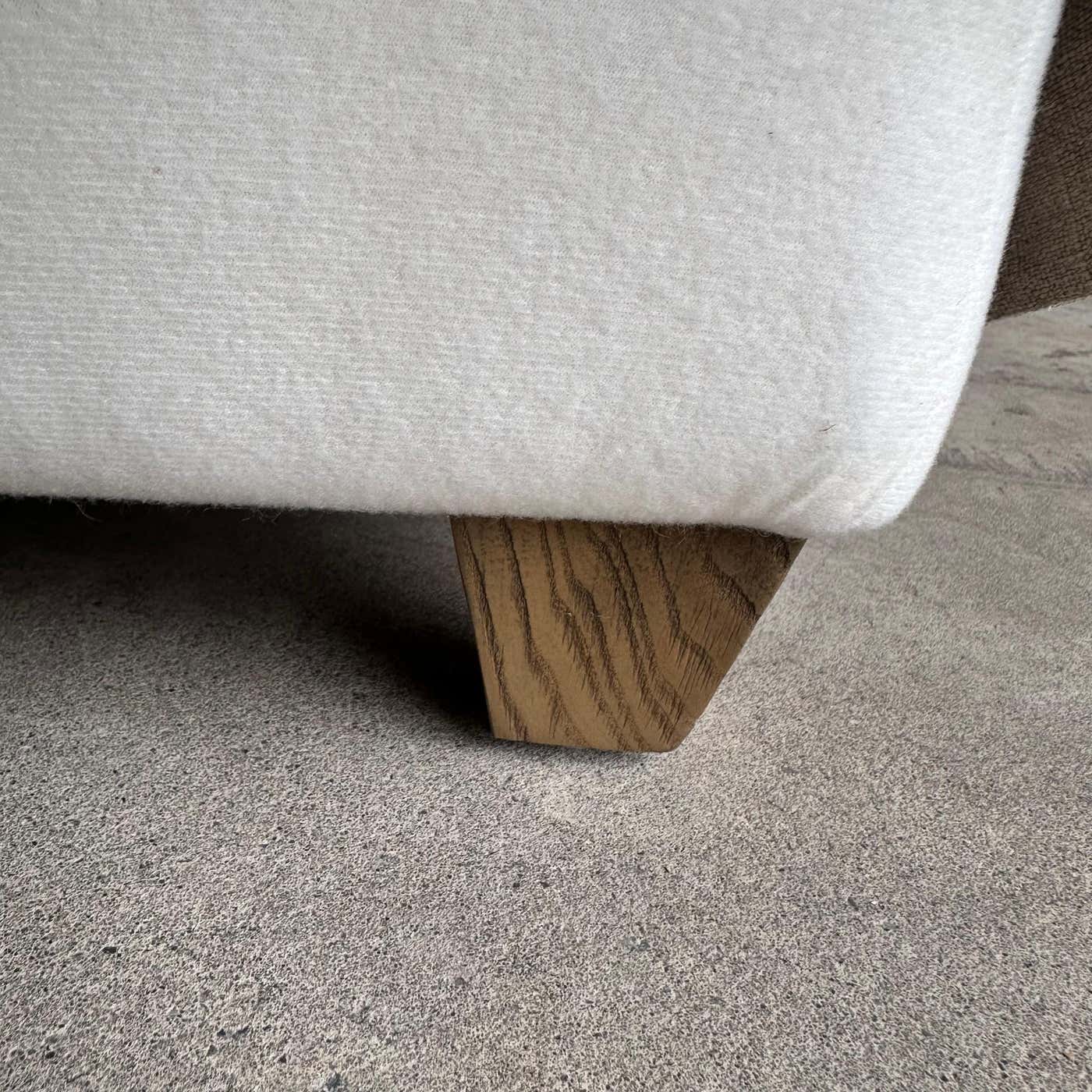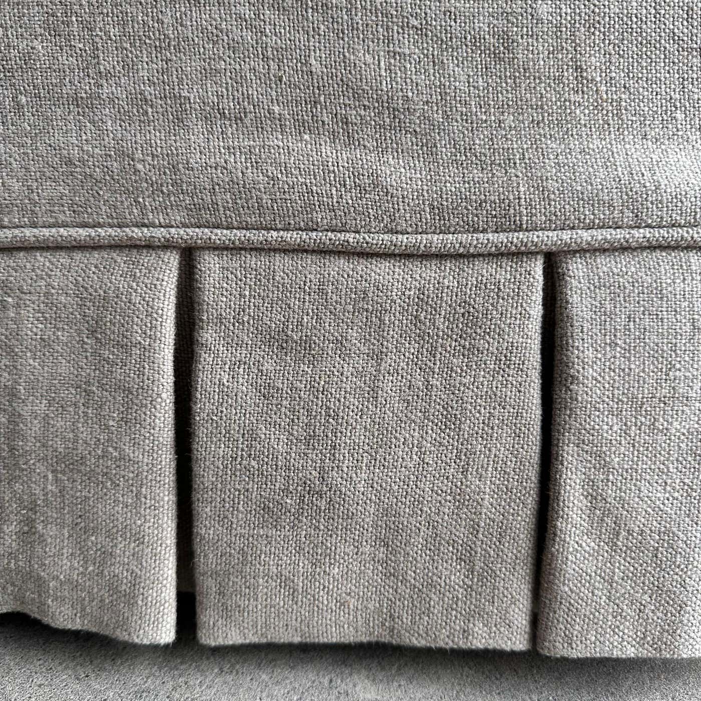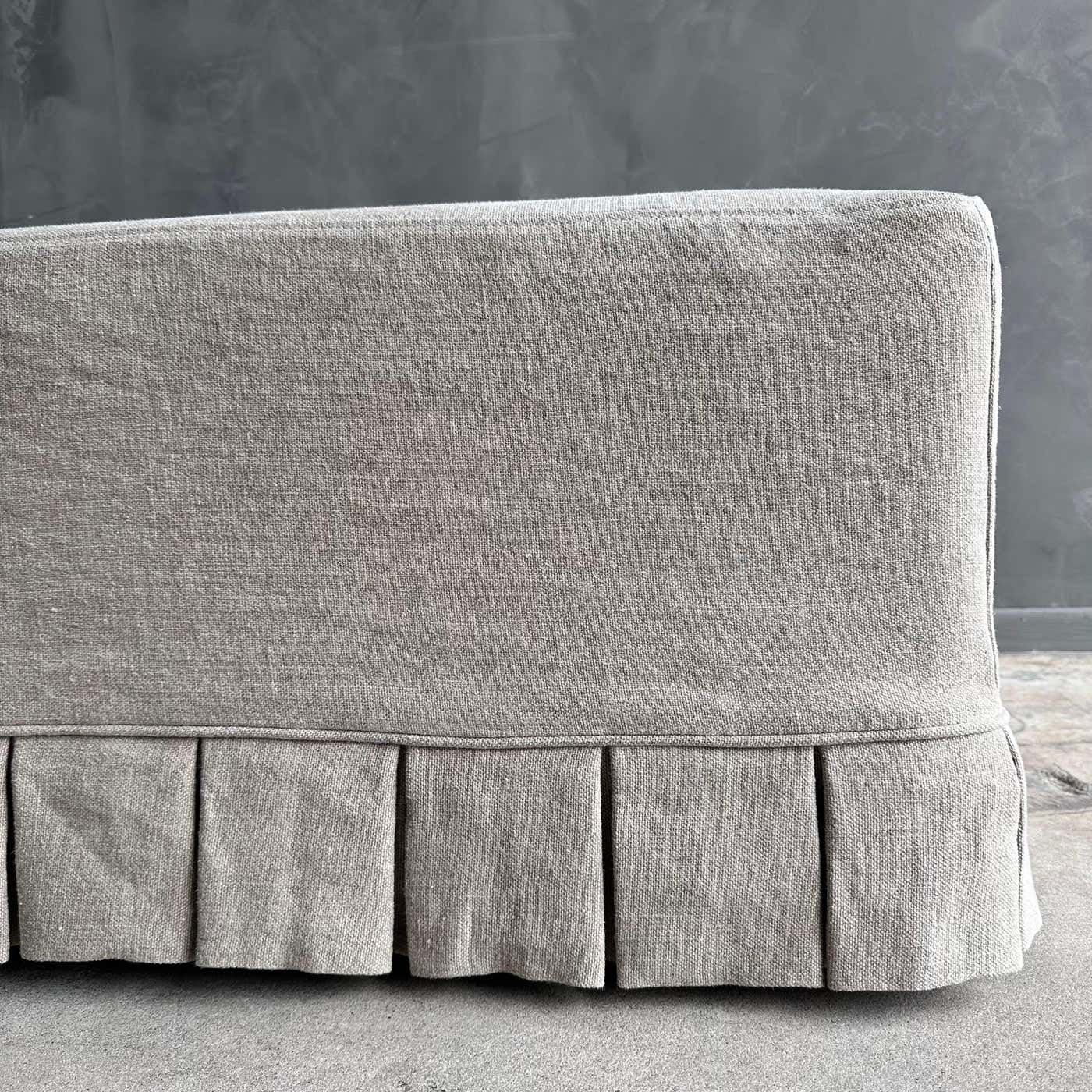 Introducing the April slip covered bench, featuring elegant white oak legs and a slip cover with a wide pleated skirt made from our luxurious greige oatmeal linen.