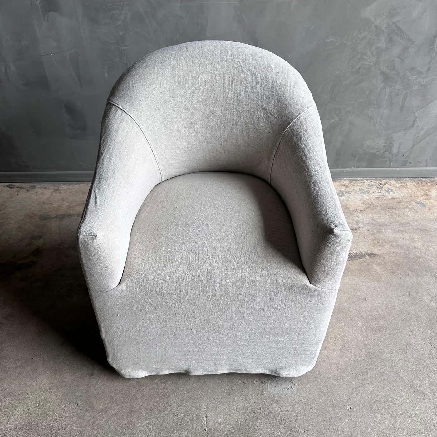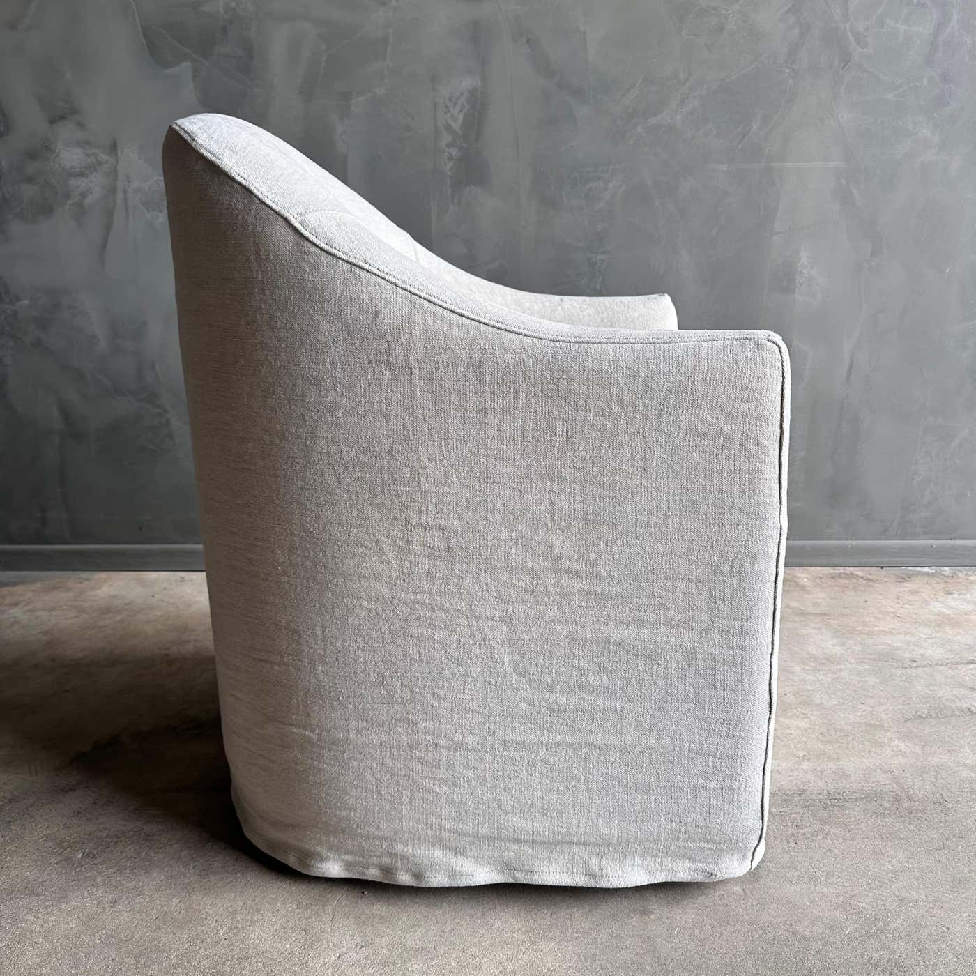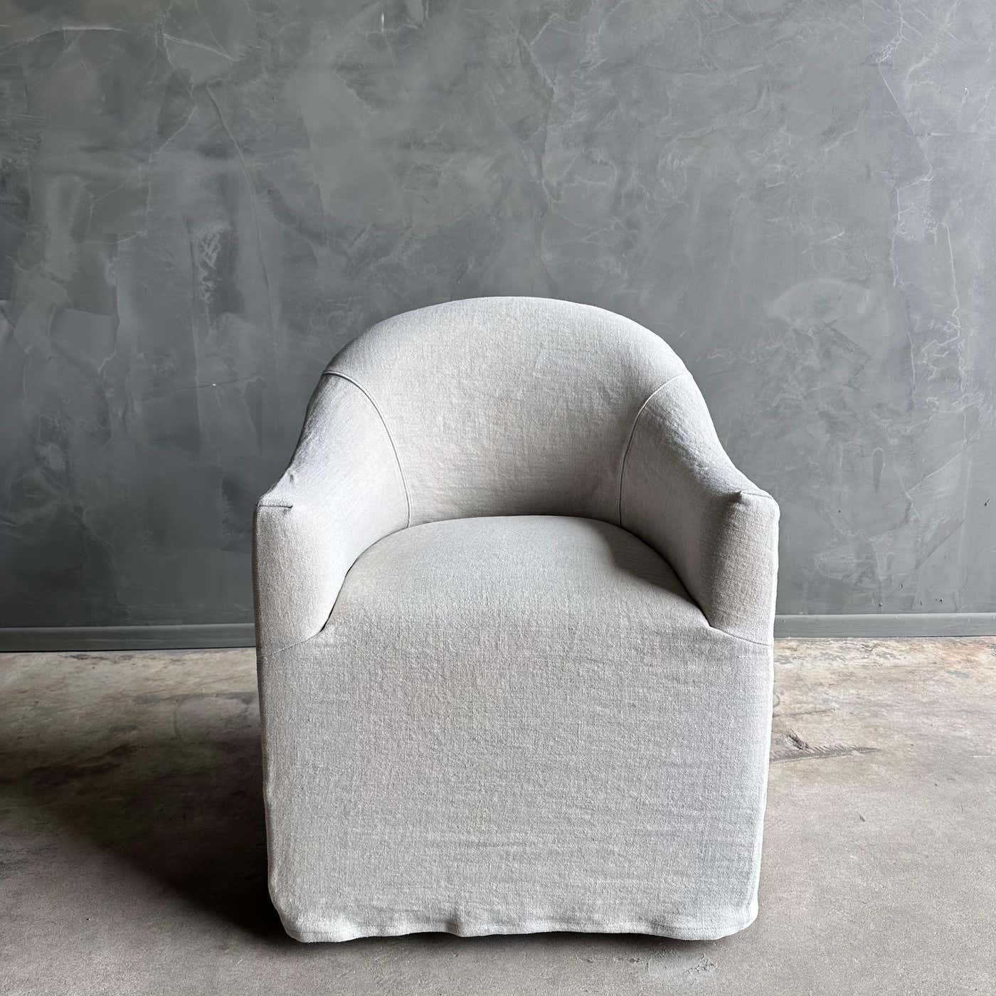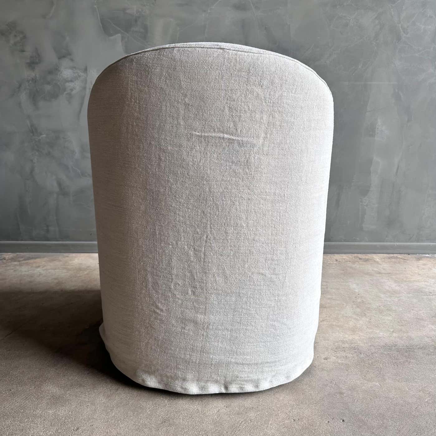 This chair features a heavy stone washed linen slip cover in an elegant oatmeal greige color, giving it a sleek modern casual look. The soft hand of the linen adds a touch of luxury to your dining space.
